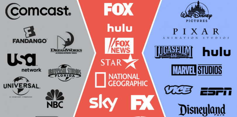 Algumas empresas de cada grupoIsso acabaria com a grande união das produções da Marvel de que tanto se falava, e nem é só isso. Com a aquisição, a Comcast se manteria como o maior conglomerado de mídia do mundo.